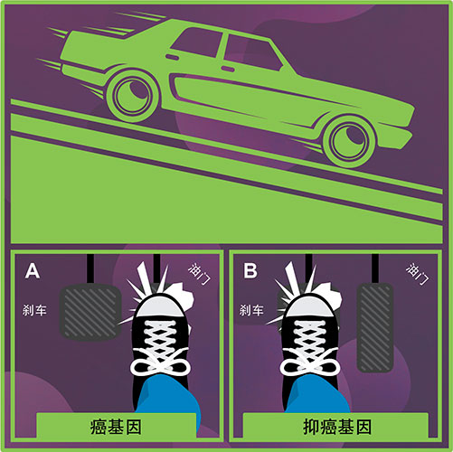 图3. A:癌基因中某些突变的影响就像汽车油门踏板被卡在踩下的位置一样。图B:同样,如果抑癌基因突变导致这些基因被“关闭”,就像刹车失灵一样。在这两种情况下,汽车都会无法停止,只能不断向前冲。在细胞中,癌基因或抑癌基因的突变通常会导致细胞失控地或异常地分裂(癌症)。