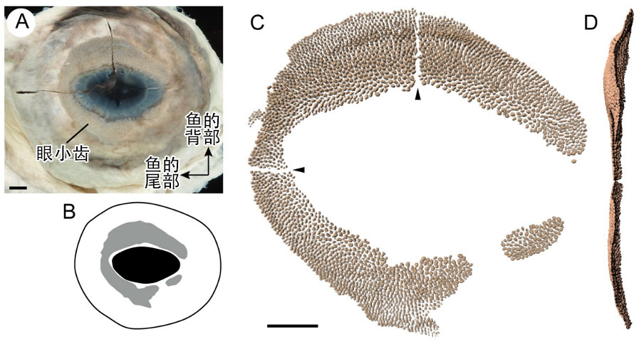 迄今为止,还没有化石证据表明其他任何生物具有眼小齿——但也没有找到鲸鲨眼小齿的化石,这可能反映出眼小齿成为化石而保存下来的可能性很低。一些石化的软骨鱼(如鲨鱼和鳐鱼)具有眼甲。例如一种已灭绝的鲨鱼(Cladoselache)的眼睛虹膜周围有骨质的圆环。它们嵌入在巩膜中(人类眼球白色的部分就是巩膜),因而被称为“巩膜环”。巩膜环存在于大多数脊椎动物群体的典型动物中,包括大眼鱼龙(图 3)——但现存的哺乳动物和鳄鱼没有巩膜环。巩膜环有助于支撑动物的眼球。5 但巩膜环的结构与鲸鲨独特的眼小齿差异很大。